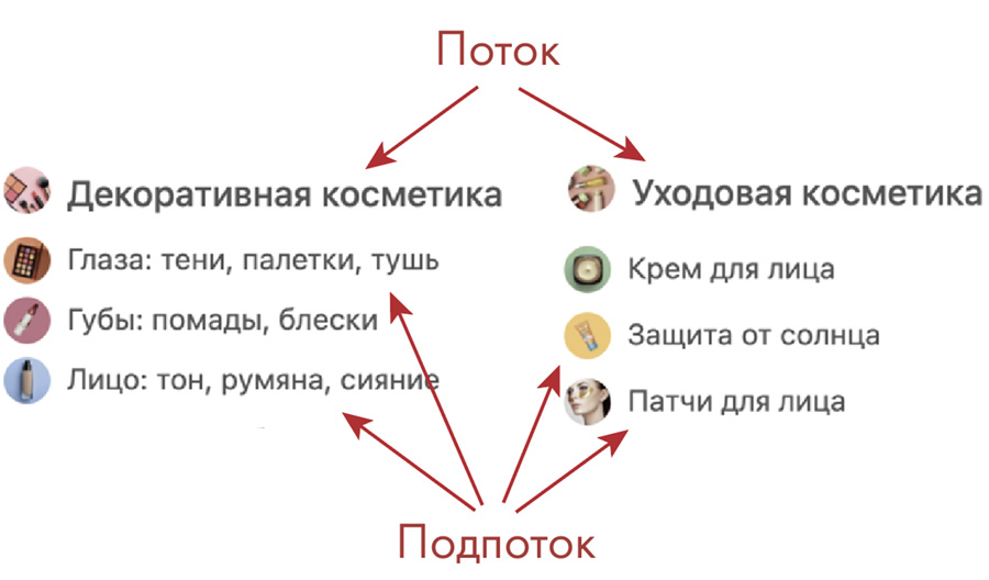 Форматы главных потоков распространяются на подпотоки, например, формат потока «Декоративная косметика» действует для подпотока «Глаза: тени, палетки, тушь». Потоки без форматов: «Хранение косметики», «Путешествия», «Осознанное потребление», «Авторы Косметисты», «Косметология».